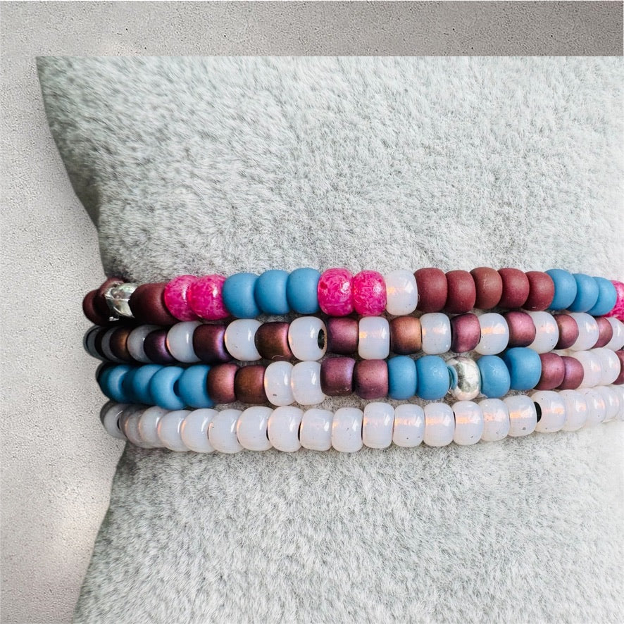 Warm, grounded, and full of soft shimmer. The Sunset Stroll Stack blends dusty rose, muted blue, soft white, and rich berry tones for a cozy, effortless vibe — perfect for golden hours, crisp walks, and slow, dreamy days.
