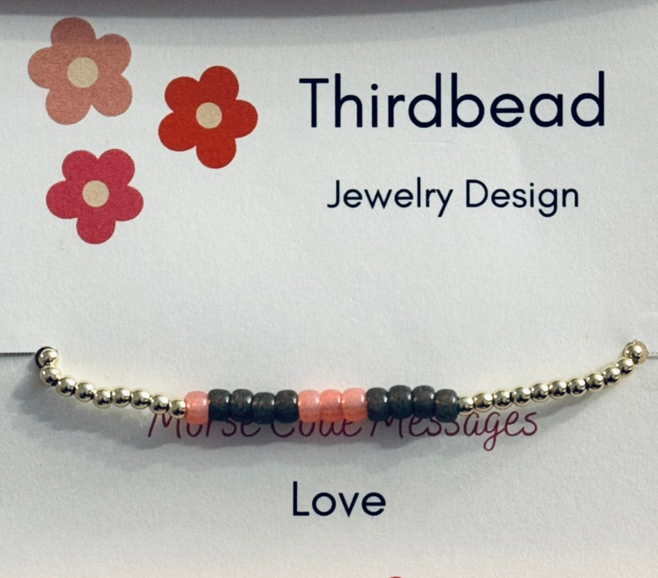 Morse code LOVE bracelet. Designed using International Morse Code with each letter designated by alternating color beads.