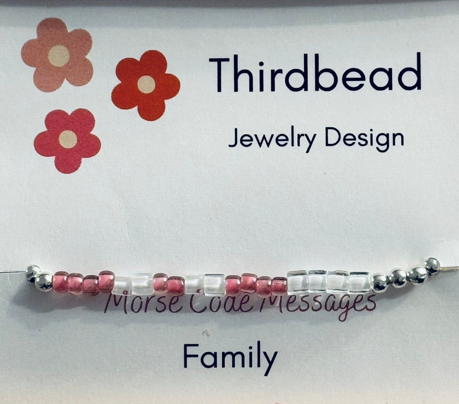 Morse code FAMILY bracelet. Designed using International Morse Code with each letter designated by alternating color beads.