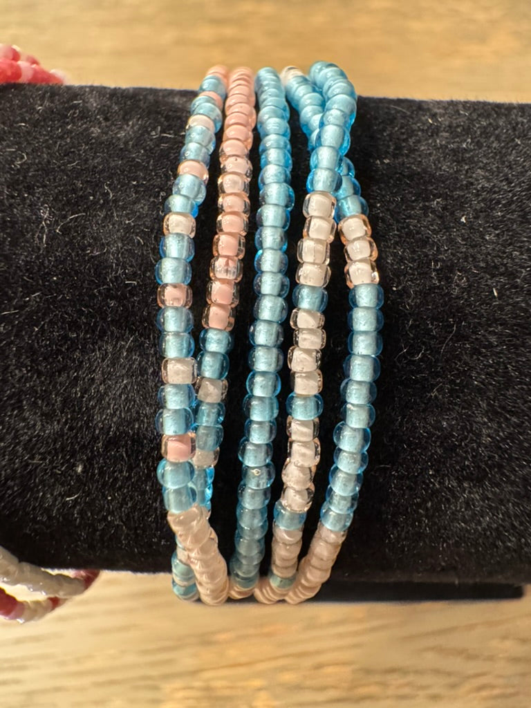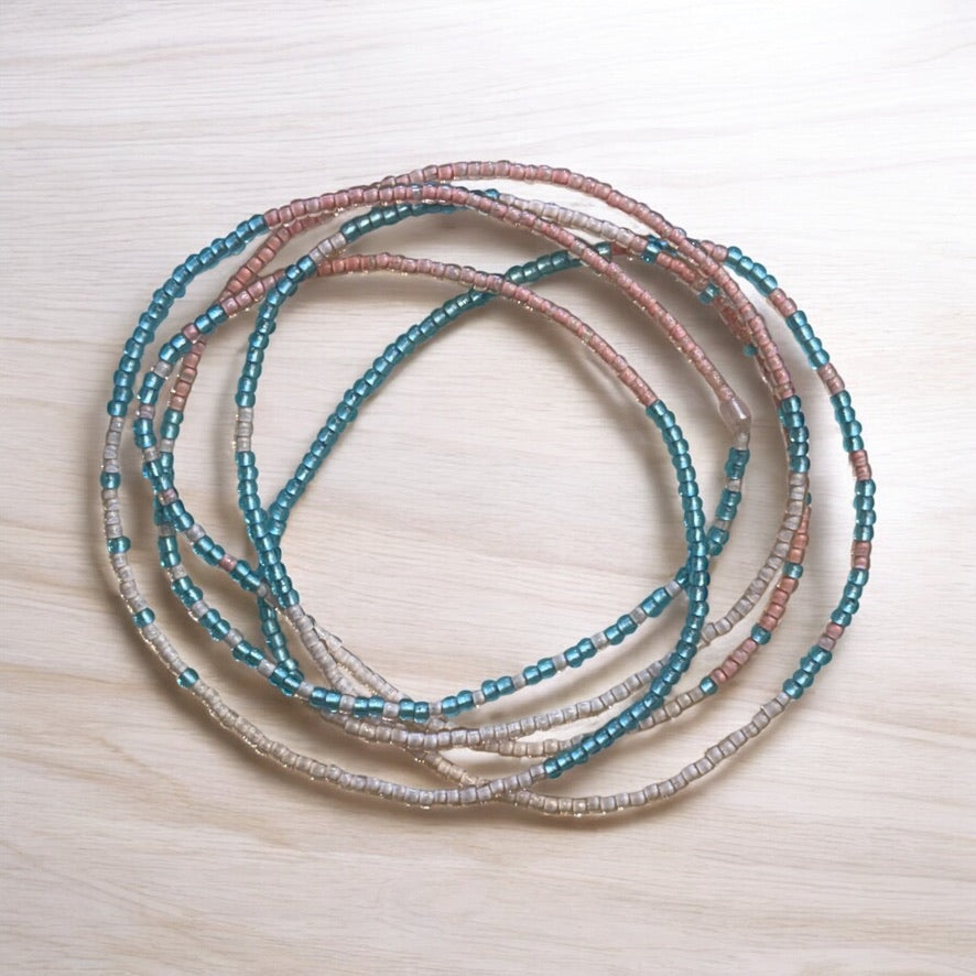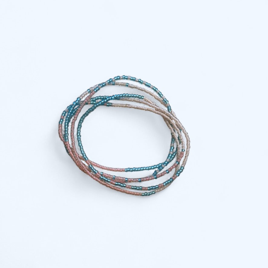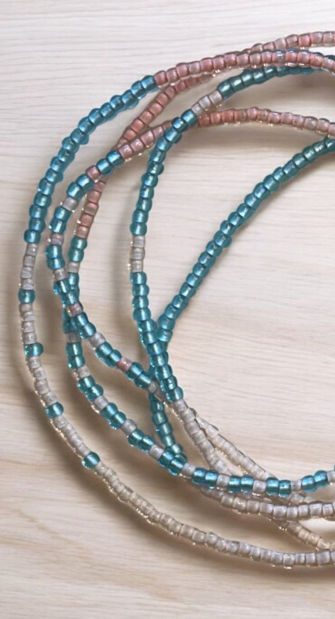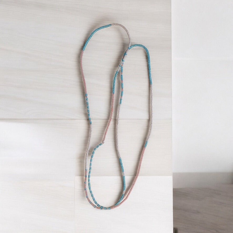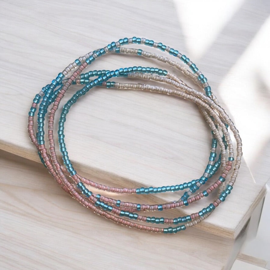 Soft pinks, shimmering champagne, and cool tealβthis wrap brings all the beachy vibes in one easy, breezy look. Wrap it around your wrist or ankle, or let it flow as a long, lightweight necklace.