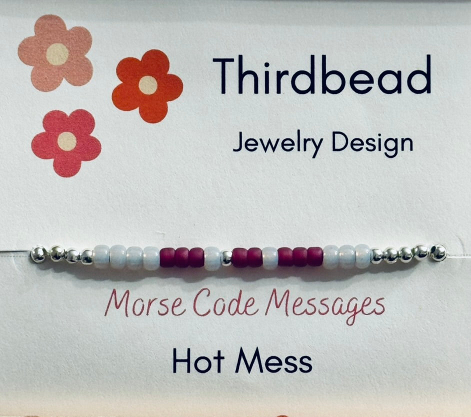 Morse code HOT MESS bracelet. Designed using International Morse Code with each letter designated by alternating color beads.